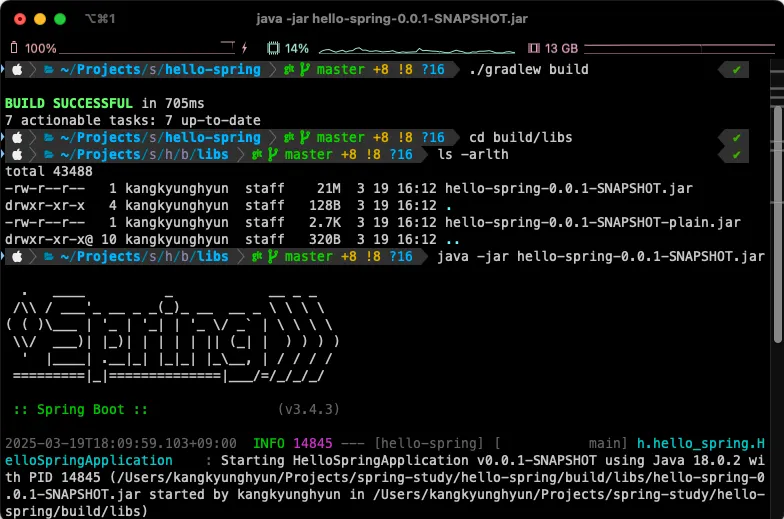 - hello-spring-0.0.1-SNAPSHOT.jar을 복사하여 실행 명령어를 입력하면 성공적으로 스프링 부트를 실행할 수 있습니다.