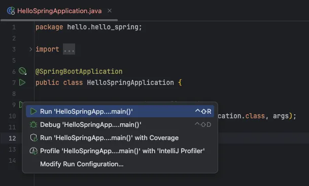 - src/main/java/hello.hello-spring/HelloSpringApplication.java의 main 함수를 실행합니다.