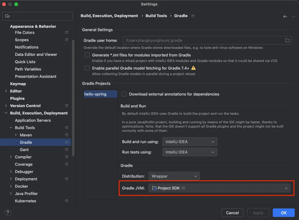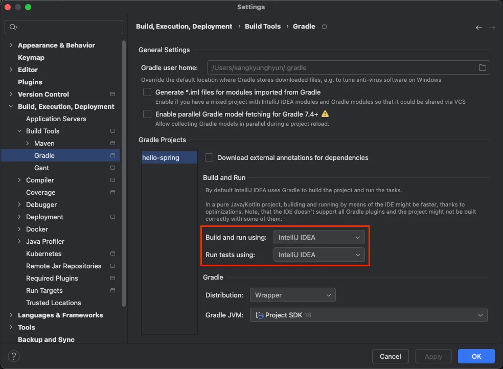 - [Settings(⌘,) → Build, Execution, Deployment → Build Tools → Gradle]로 이동합니다.