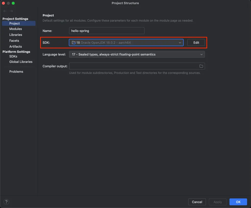 - [Project Structure(⌘;) → Project Settings → Project]로 이동합니다.