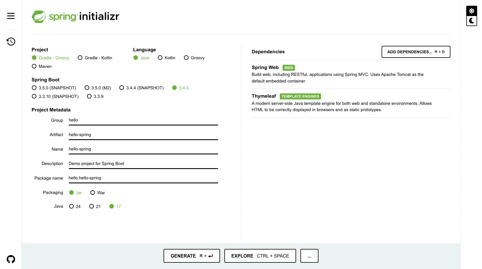 - Packaging은 Jar, Java는 17 또는 21을 선택합니다.