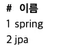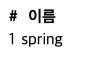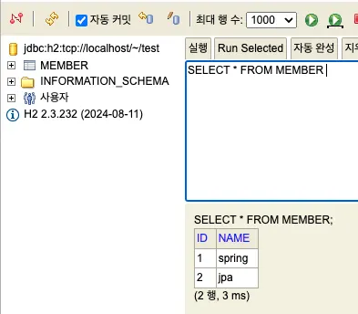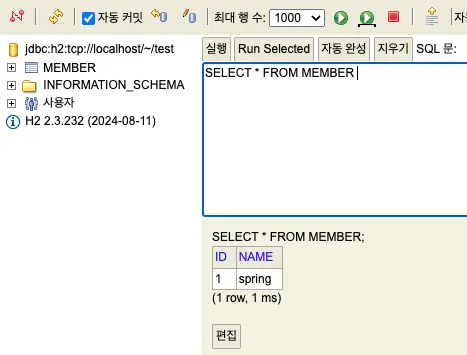 NAME으로 입력했던 **‘spring’**이 들어갔고 ID는 자동으로 1이 채워진 것을 볼 수 있습니다.
