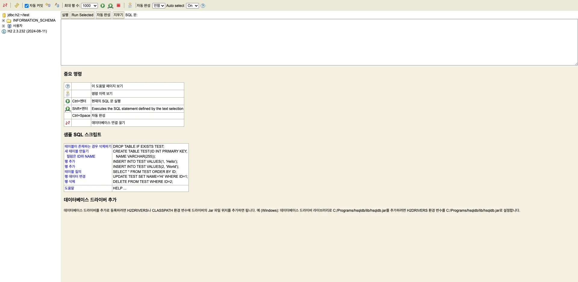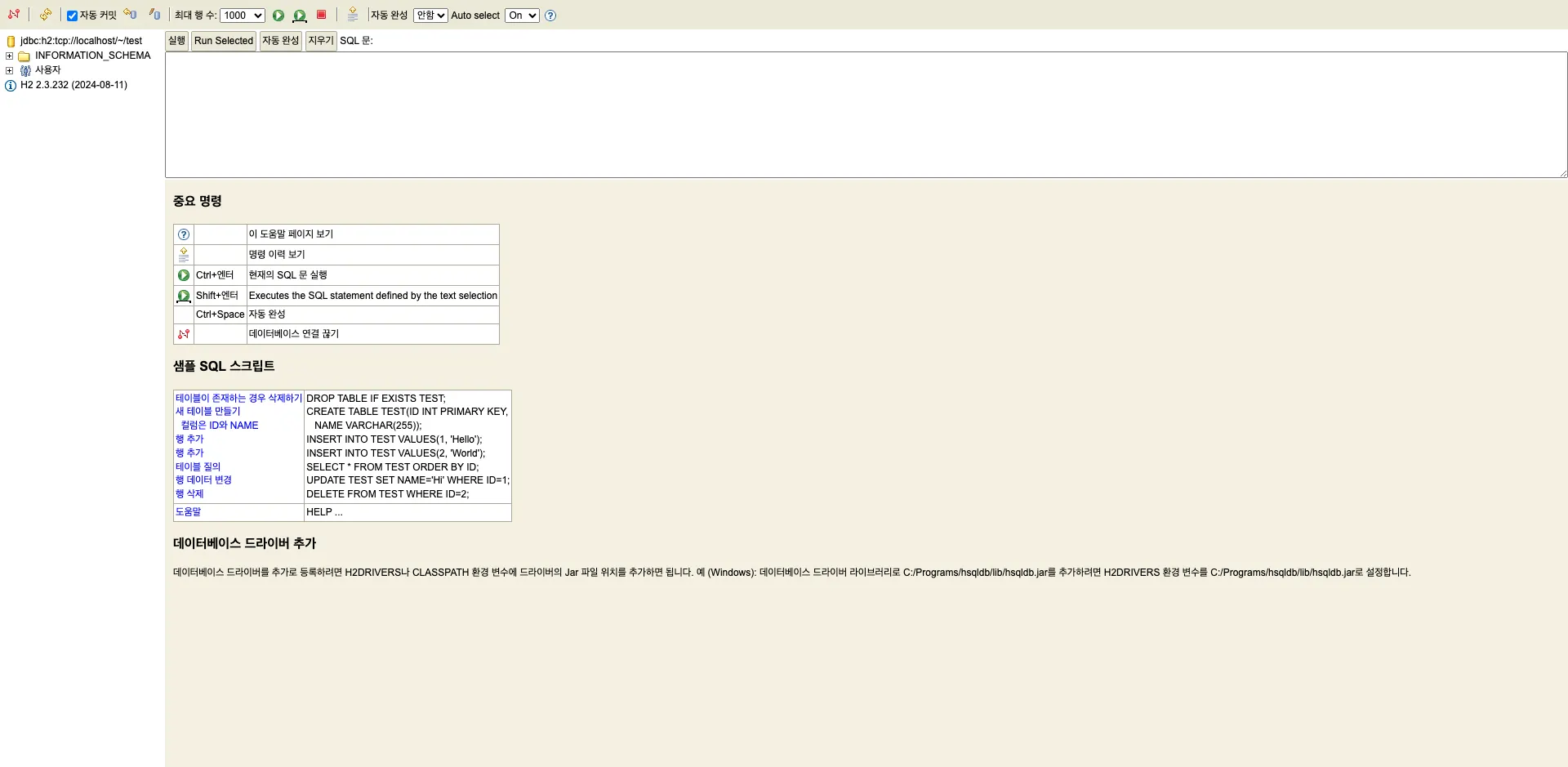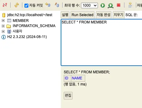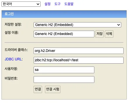 - 정상 작동하면 이후부턴 jdbc:h2:tcp://localhost/~/test로 접속합니다.