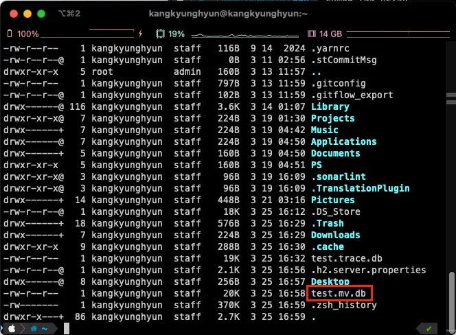 이런 페이지가 뜹니다. 이제 Terminal에서 ls -arlth를 입력해서 test.mv.db 파일이 있는지 확인합니다.