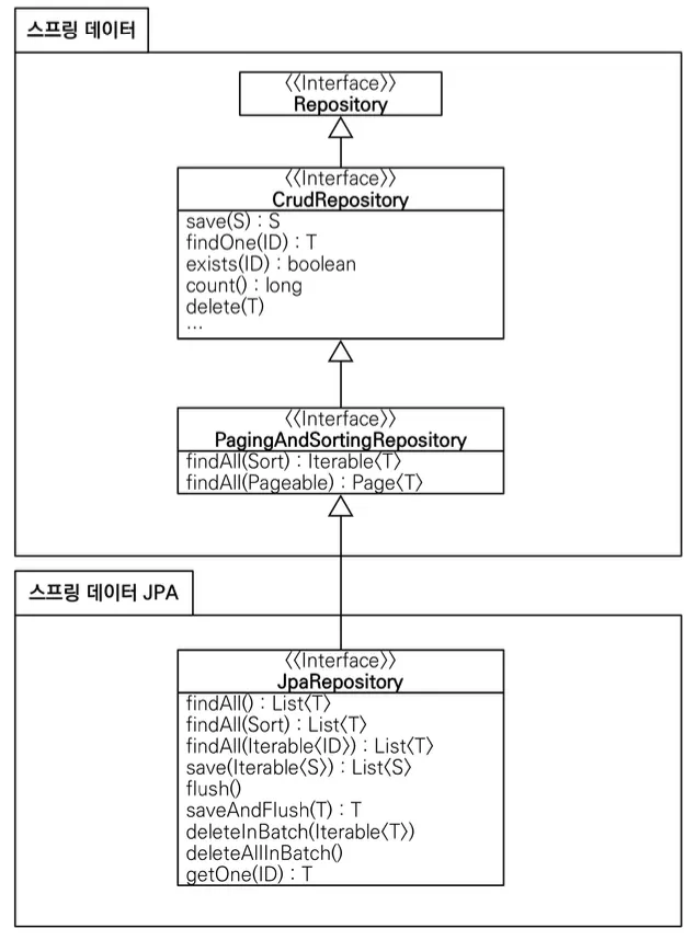 - 스프링 데이터 JPA는 인터페이스를 통한 기본적인 CRUD를 제공합니다.