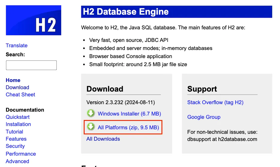 H2 데이터베이스를 설치해보겠습니다. https://h2database.com/html/main.html에 접속해서 최신 버전을 All Platforms로 다운로드합니다.