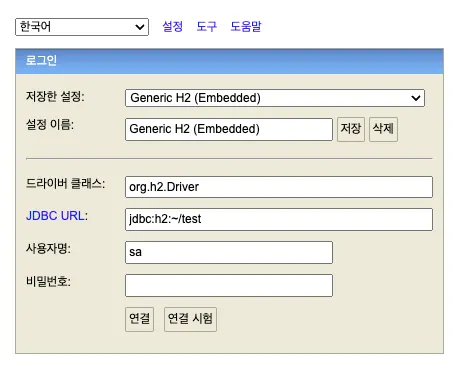 - H2 DB를 실행하고 jdbc:h2~/test 링크로 접속합니다. 최초 1회는 반드시 이 링크로 접속해야 test.mv.db가 생성됩니다. 소켓으로 접속하려고 하면 test.mv.db가 존재하지 않는다고 뜹니다.