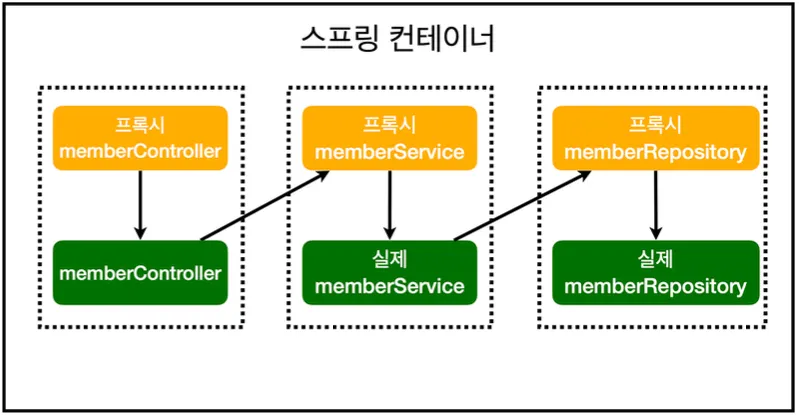AOP를 memberService에 적용하면 스프링 빈으로 등록될 때 실제 객체 대신 프록시 객체가 스프링 컨테이너에 등록됩니다. 메서드가 호출되면 먼저 프록시 객체의 메서드가 실행되어 AOP 로직을 수행합니다. joinPoint.proceed() 메서드가 호출되면 프록시가 실제 객체의 메서드를 호출하여 비즈니스 로직이 수행됩니다.