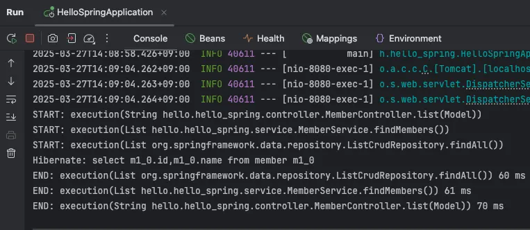 시간 측정 AOP 코드를 작성 후 실행하면 위 사진처럼 메소드마다 실행 시간을 알 수 있습니다.