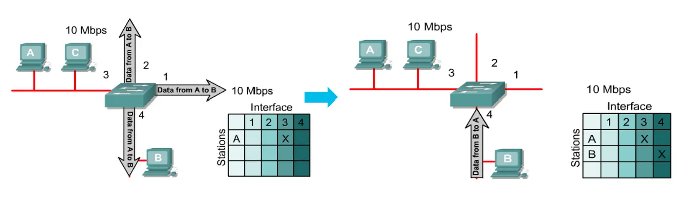 - A에서 B로 향하는 Frame을 스위치로 전송