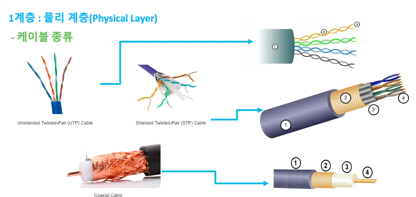 - 유선 네트워크는 대부분 **광 케이블과 구리 케이블(UTP 케이블)**을 사용