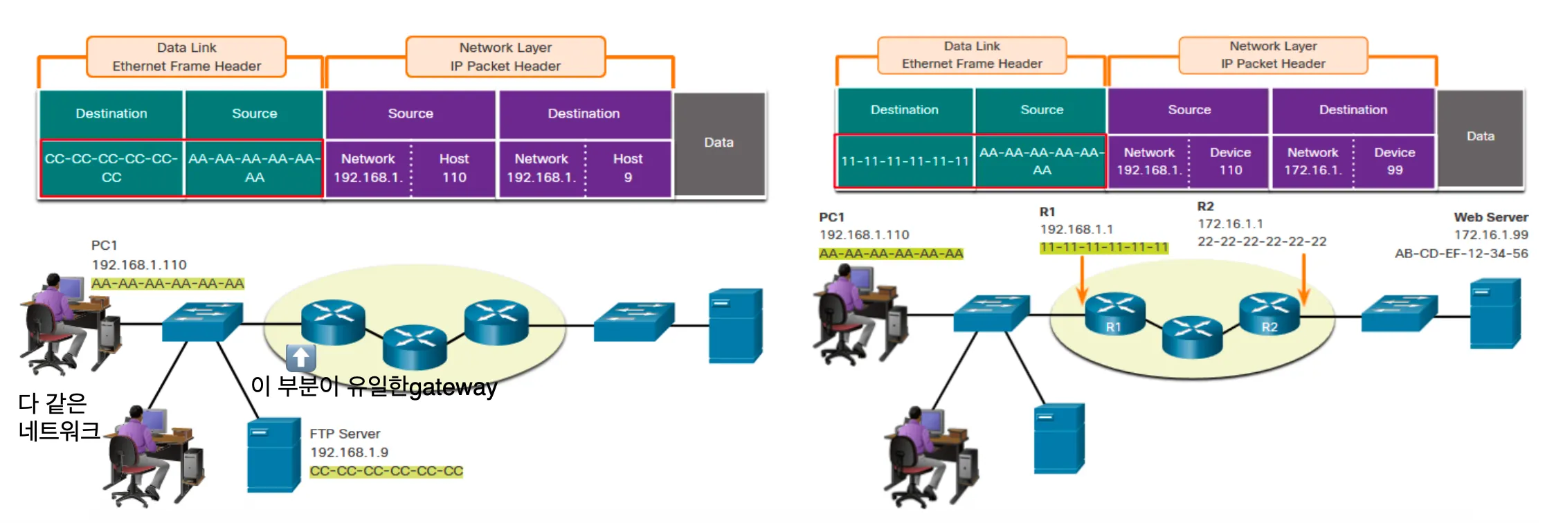 - 목적지가 다른 네트워크에 있으면, 목적지의 MAC 주소를 일단 라우터의 주소로 설정