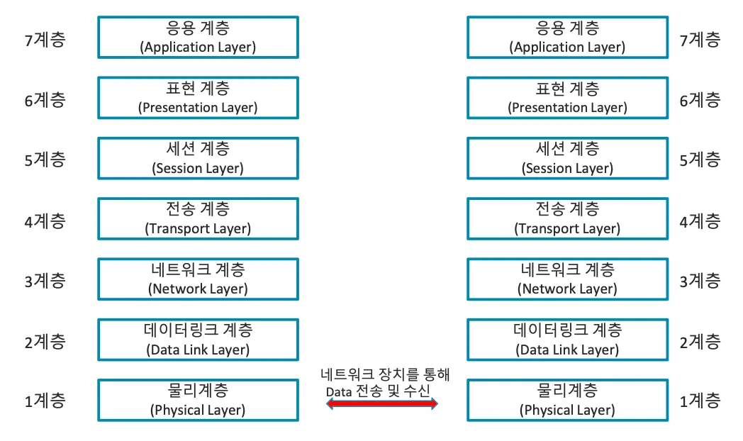 - 개방형 시스템에서 통신을 하기 위해 7개의 계층 정의