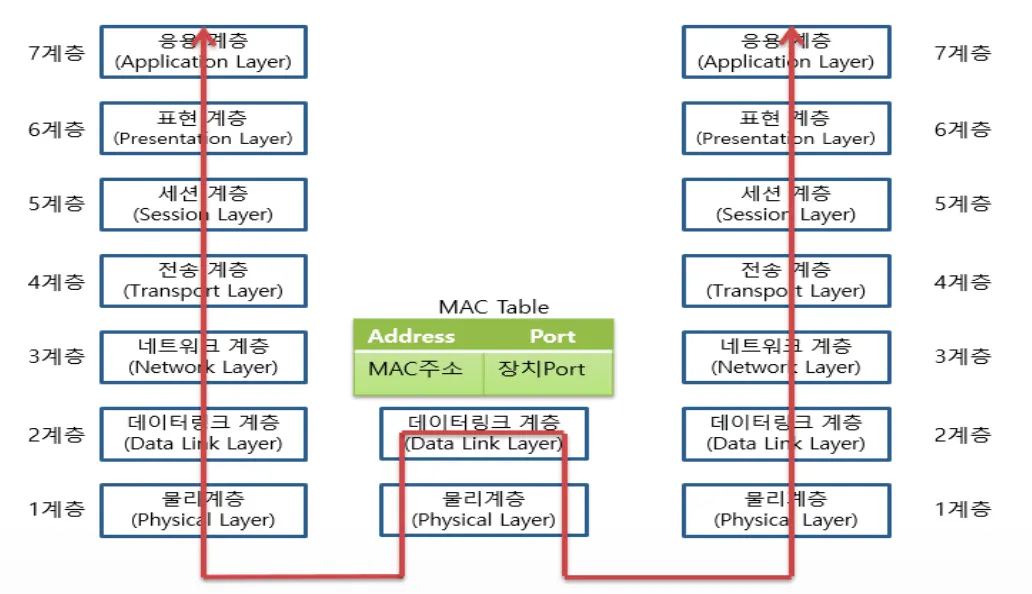 - 스위치는 프레임 전송을 위해 MAC Table(Switching Table)을 사용