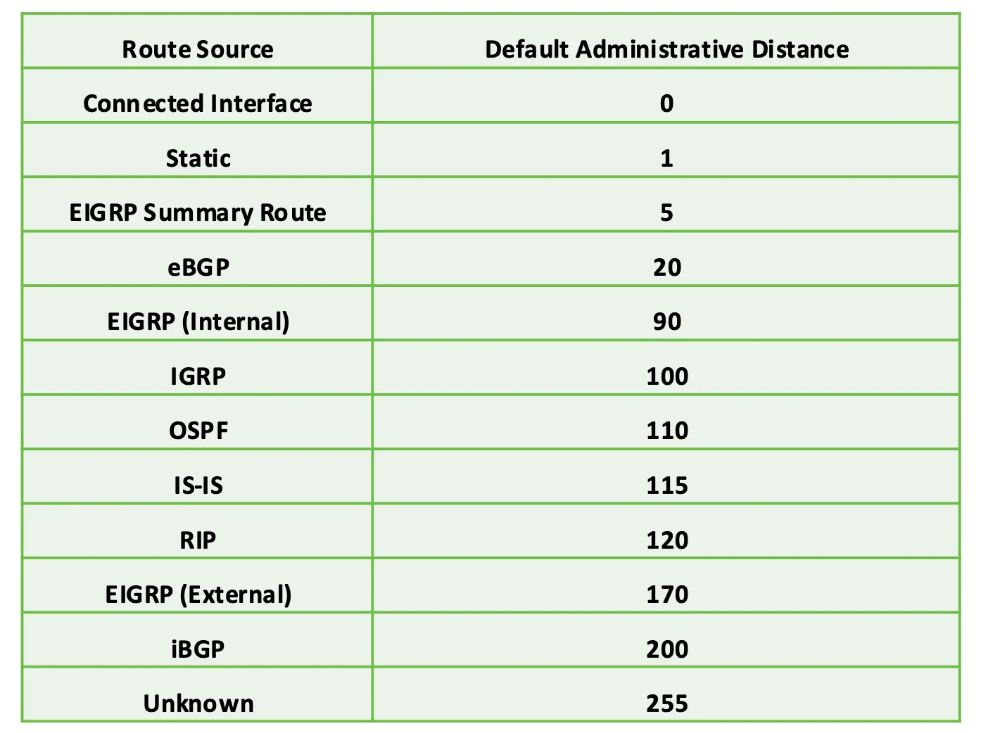 동일한 목적지 네트워크에 대하여 두 개 이상의 프로토콜로부터 경로 정보를 학습했을 때, 어떤 경로를 선택하는가의 문제