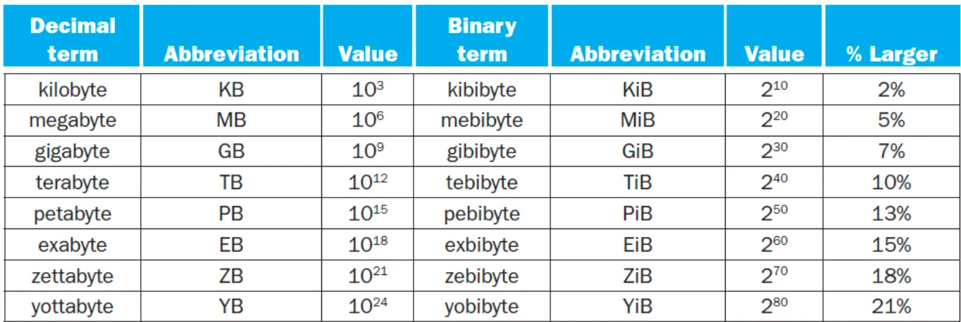 편의성을 위해 표기상 1TB = 1,000GB = 1,000,000MB = 1,000,000,000KB = 1,000,000,000,000Byte → 실제로는 1,024으로 나눔 → 1,000,000,000,000Byte = 976,562,500KB = 953,674MB = 931GB로 컴퓨터에 표시