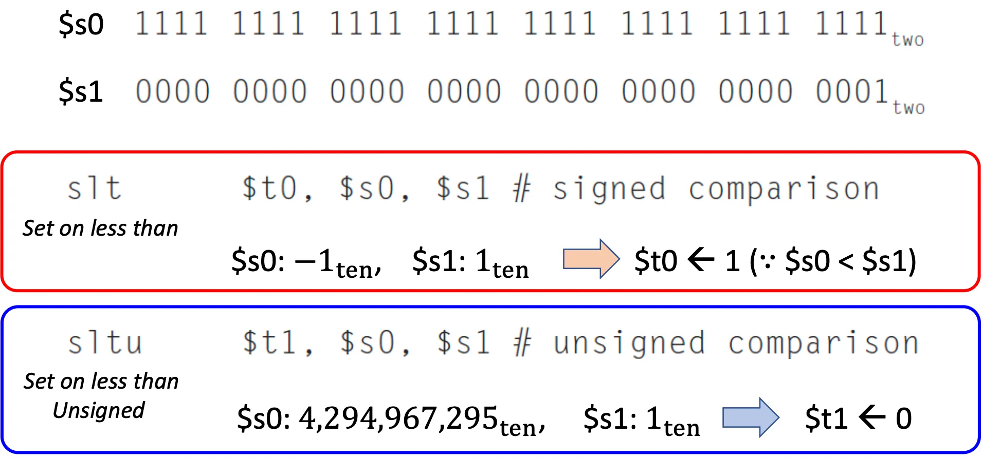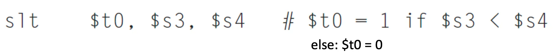 - Set on less than (slt): register1이 register2보다 작으면 1, 아니면 0