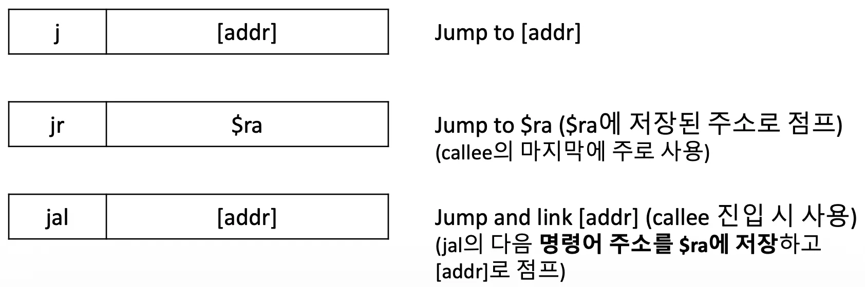 - jr: jump register, $ra: 호출한 함수의 주소 → 항상 함께 쓰임