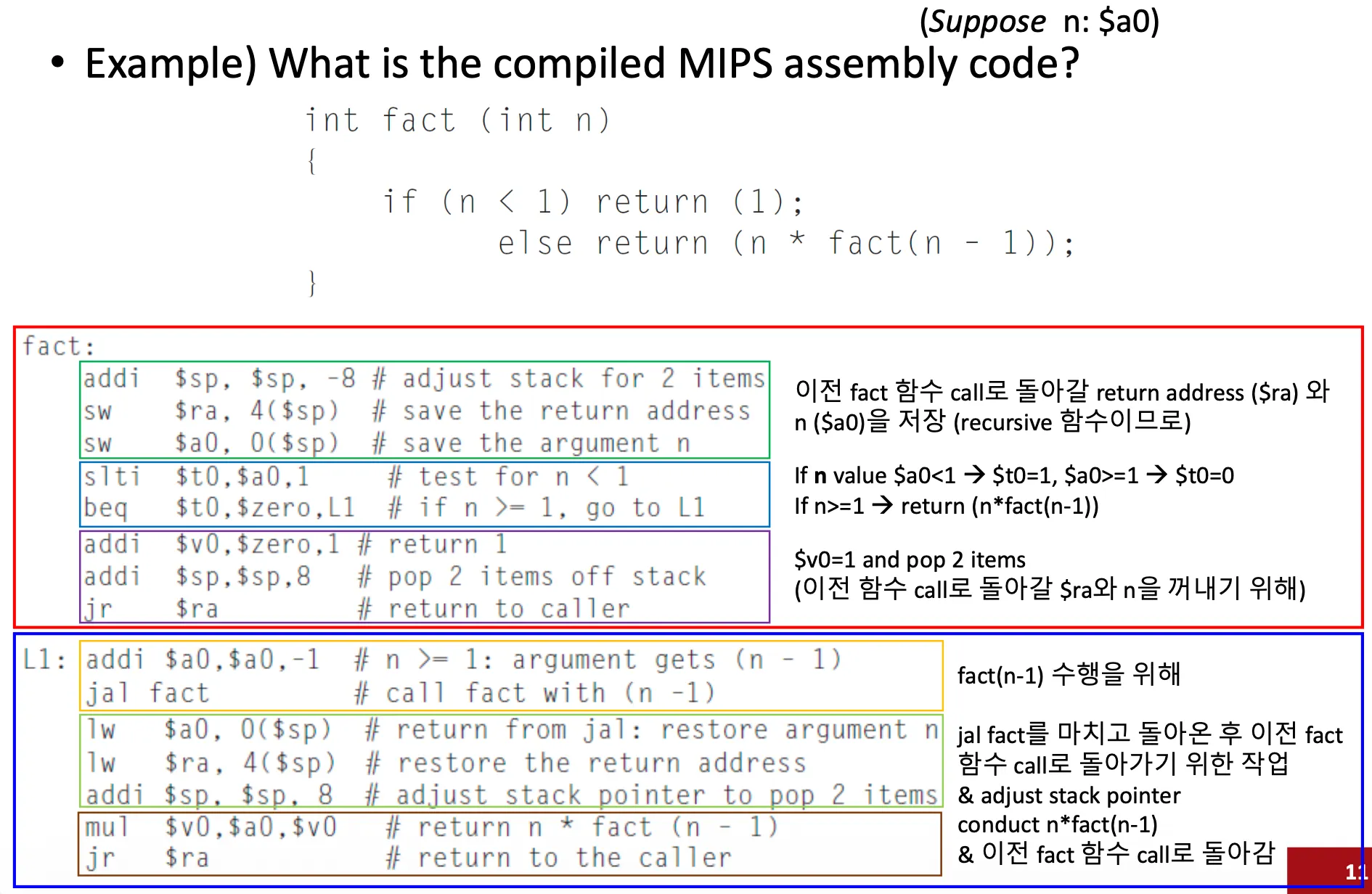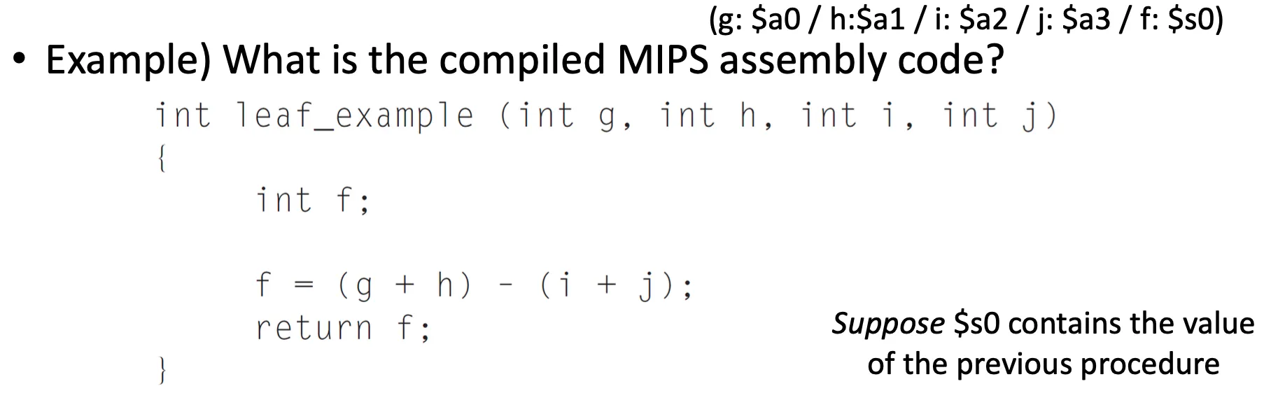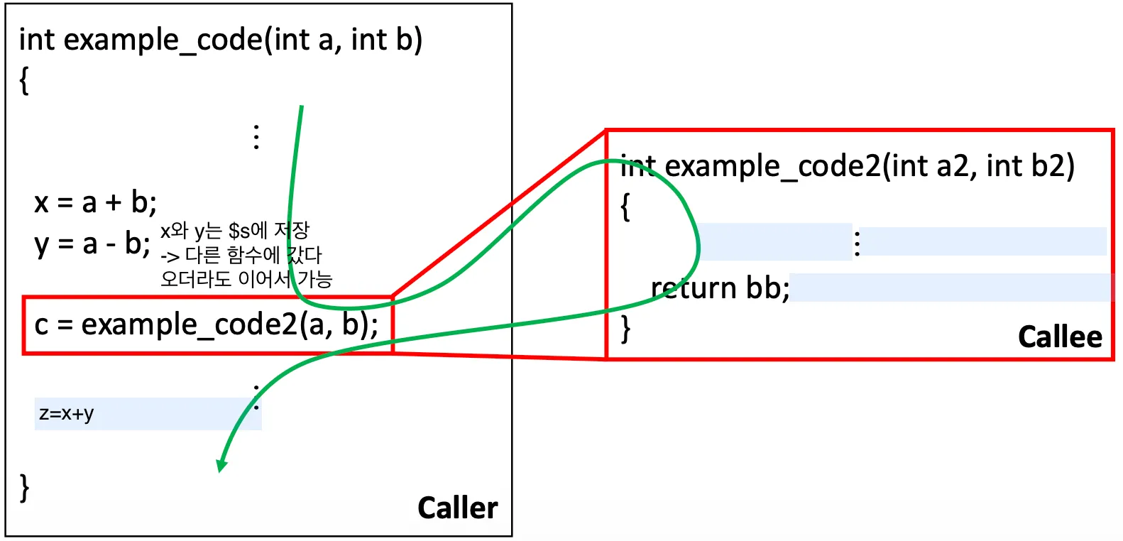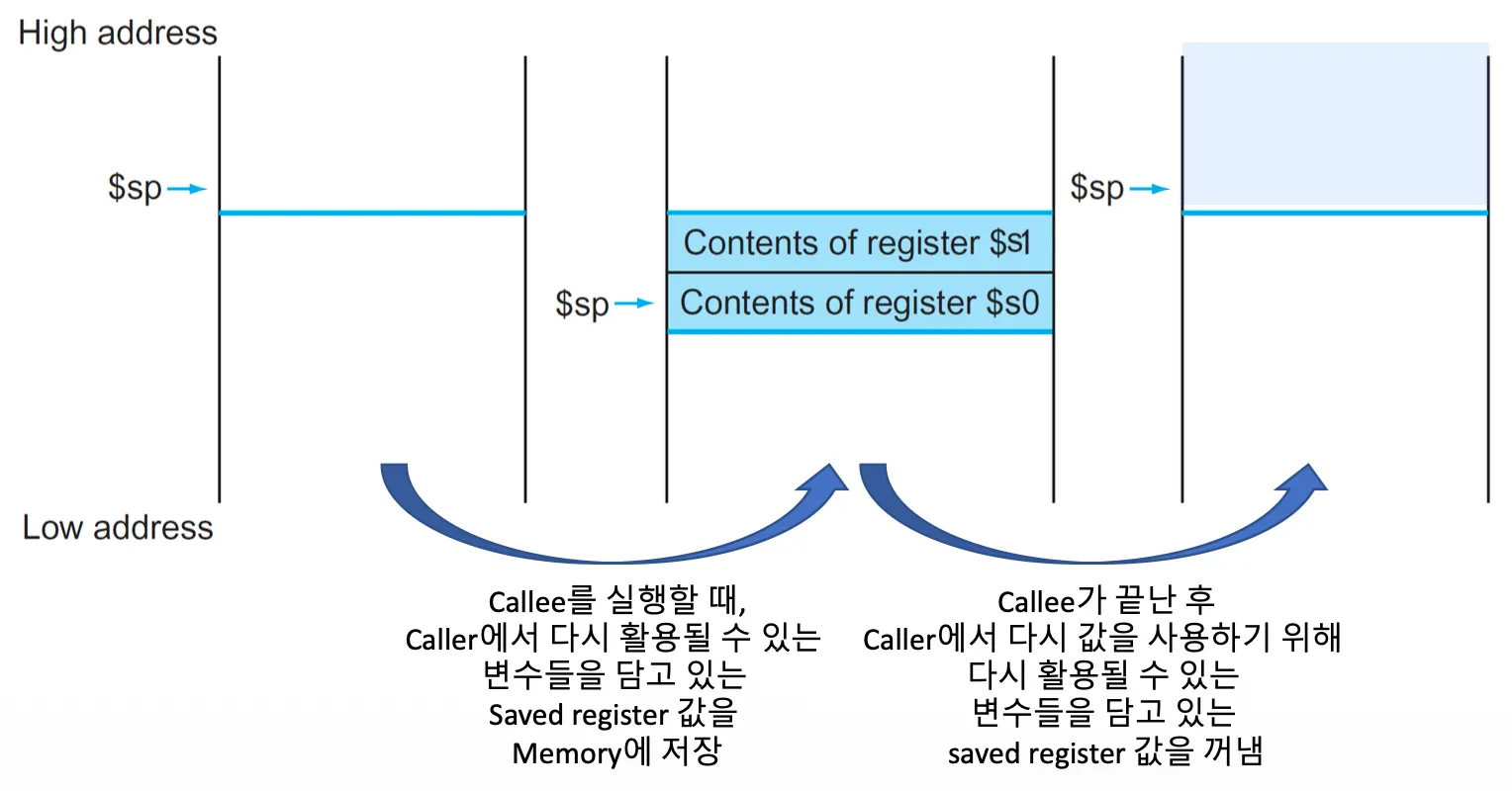 - Callee preocedur를 수행할 때, register에 저장된 값이 사라질 수 있음 → Callee procedure를 마치고 Caller procedure로 복귀할 때 다시 활용하게 될 수 있는 변수 값을 memory에 미리 저장