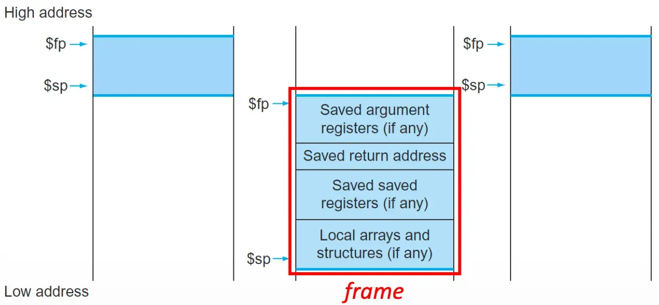 - Frame Pointer ($fp): procedure frame의 첫 word point → $sp 범위의 기준점