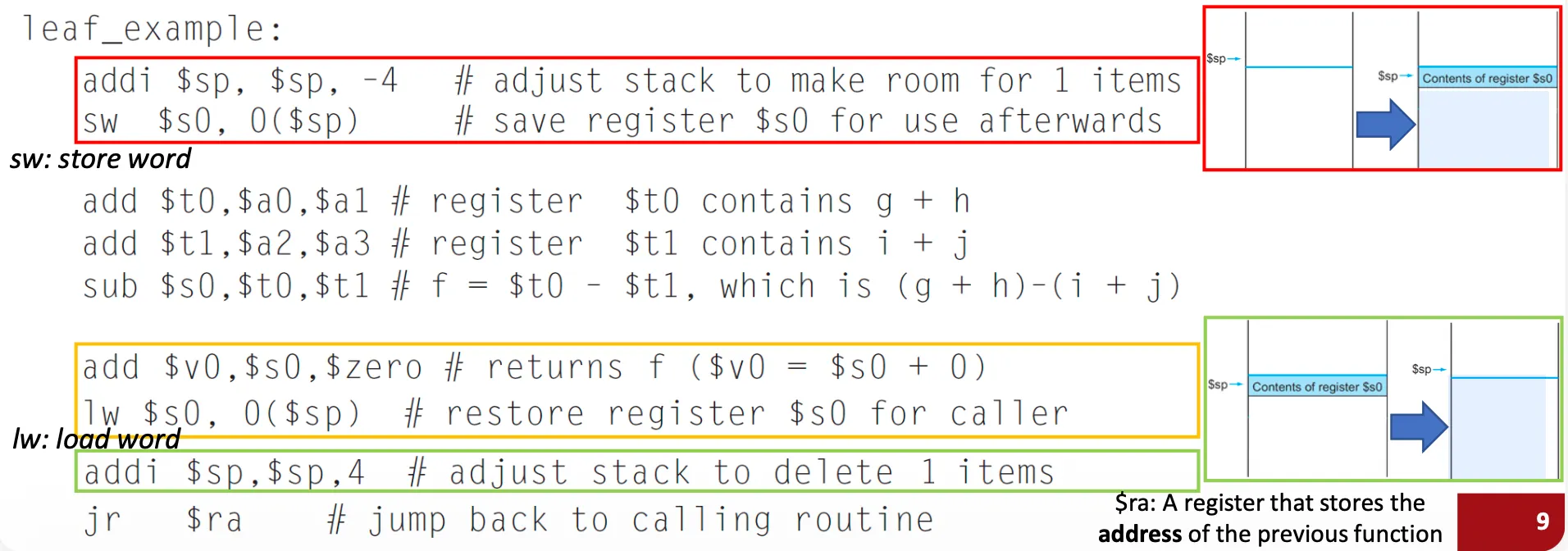 - 함수가 호출되면 스택 포인터를 내려 $s0가 저장될 공간을 메모리에 만들고 저장