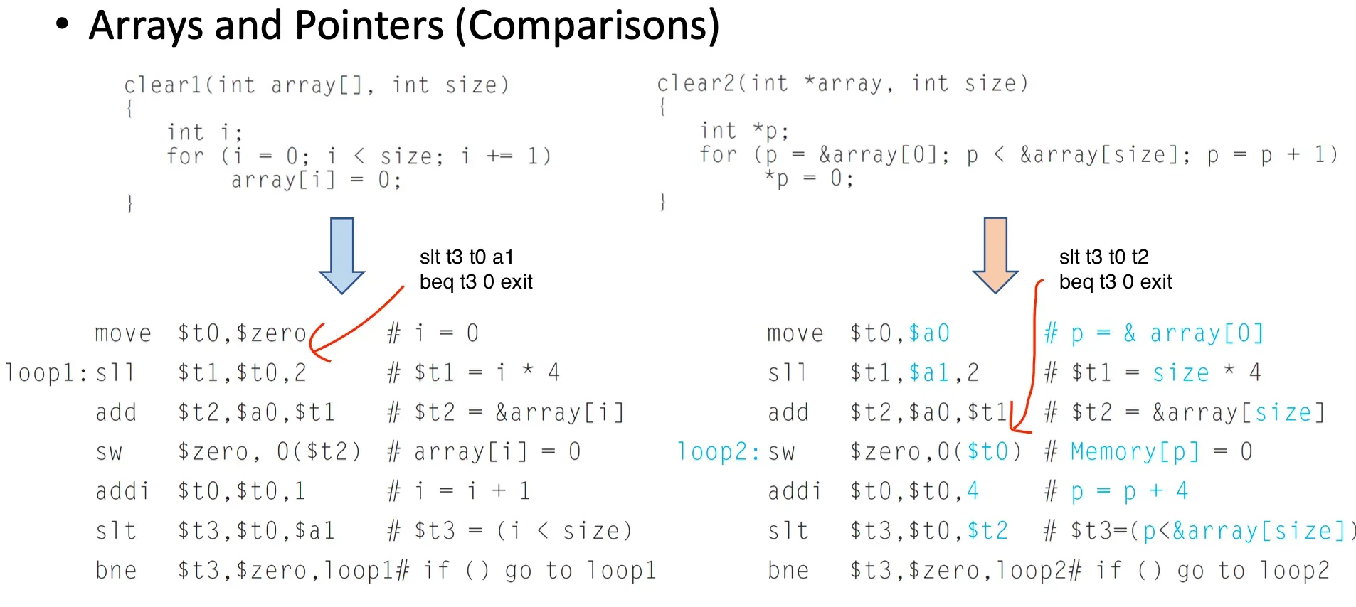 - 루프 내 인스트럭션이 Array가 Pointer보다 많다 → 루프를 많이 돌게 된다