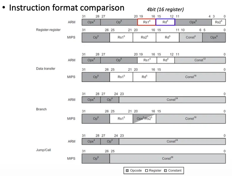 - ARM은 레지스터 할당에 4비트만 필요 → 레지스터 할당에서 줄인 만큼 데이터 어드레싱 모드 증가