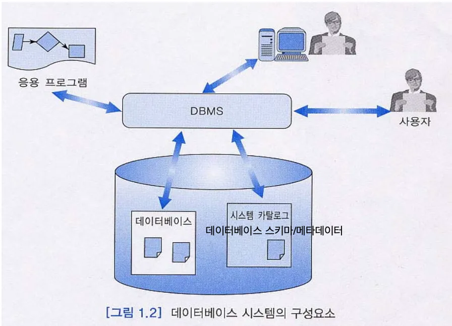 - 데이터베이스는 한 조직체의 운영 데이터 뿐만 아니라 그 데이터에 관한 설명(데이터베이스 스키마 또는 메타데이터)까지 포함