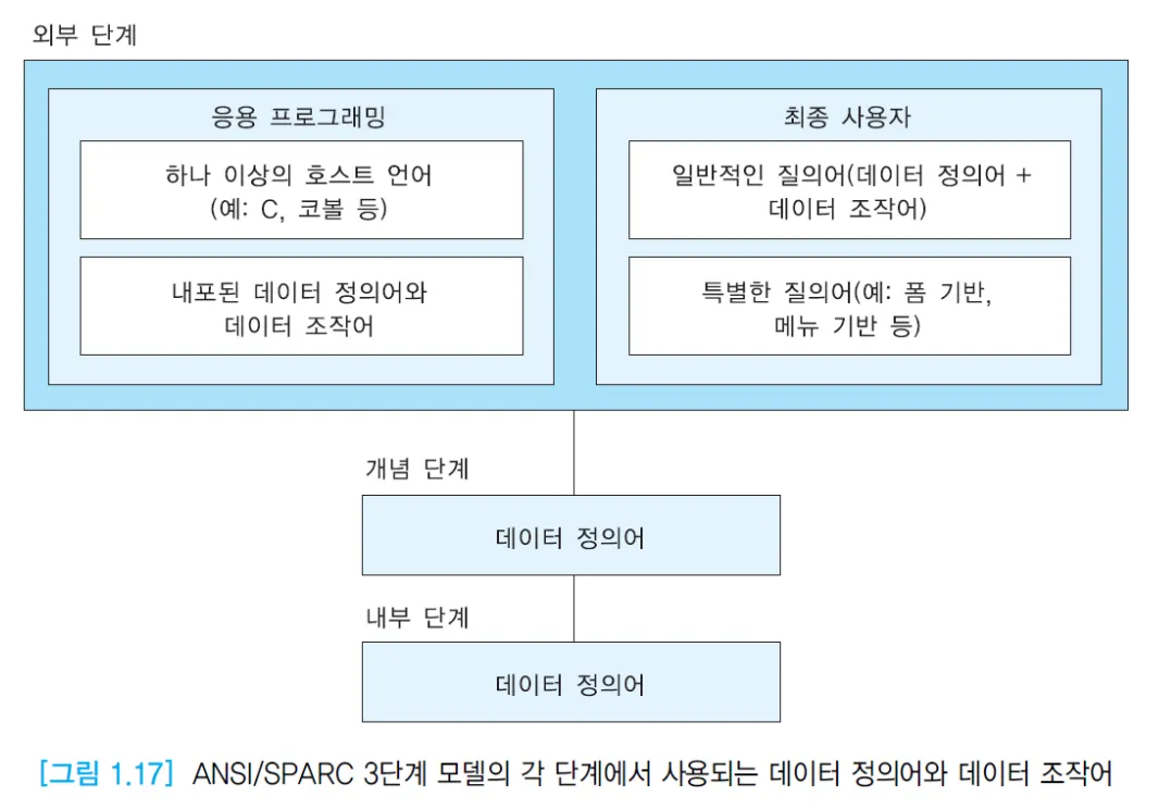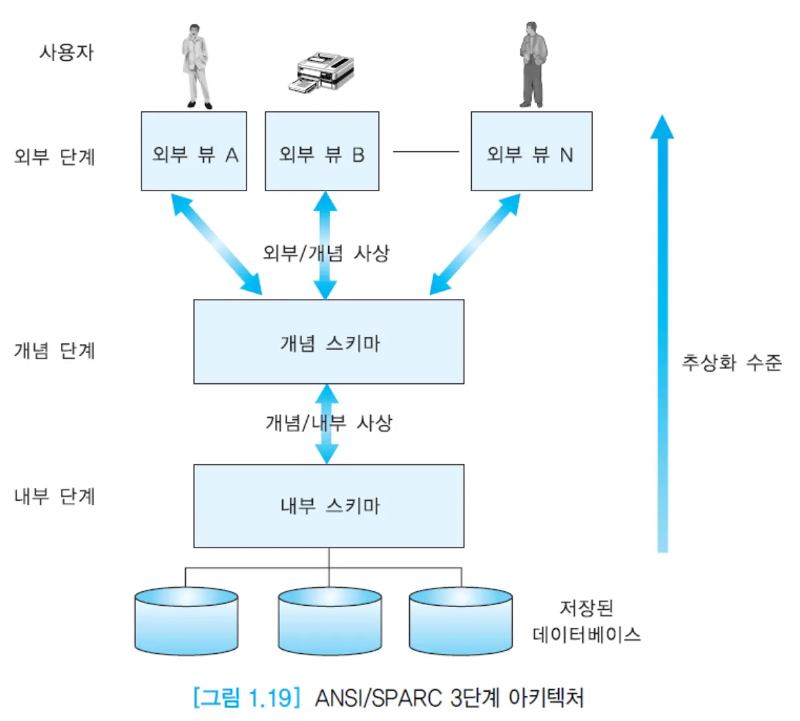 - 현재의 대부분 상용 DBMS 구현에서 사용되는 일반적인 아키텍처는 1978년에 제안된 ANSI/SPARC 아키텍처