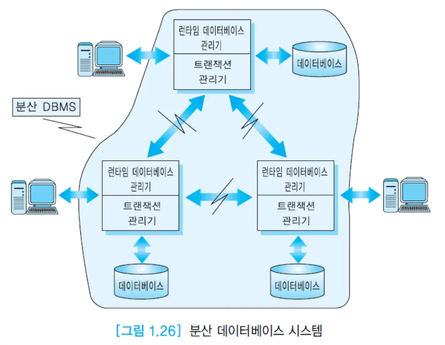 - 네트워크로 연결된 여러 사이트에 데이터베이스 자체가 분산되어 있음 → 데이터베이스 시스템도 여러 컴퓨터 시스템에서 운영