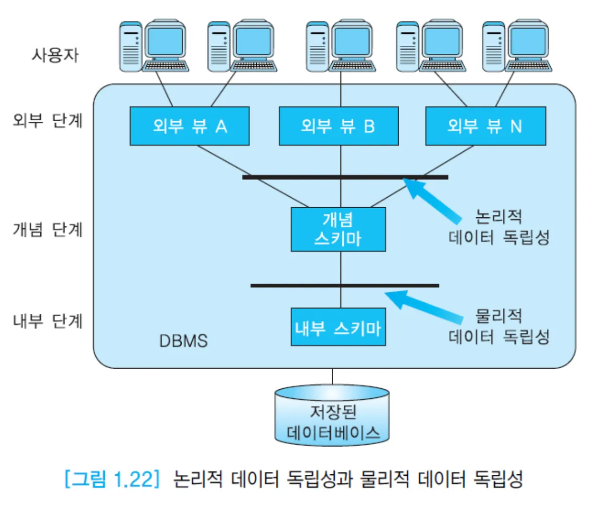 - 상위 단계의 스키마 정의에 영향을 주지 않으면서 어떤 단계의 스키마 정의를 변경할 수 있음을 의미