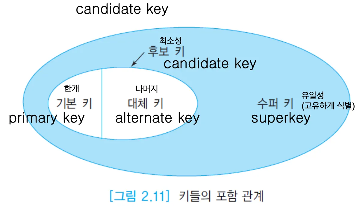 - 수퍼 키(super key), 후보 키(candidate key), 기본 키(primary key), 대체 키(alternate key), 외래 키(foreign key)