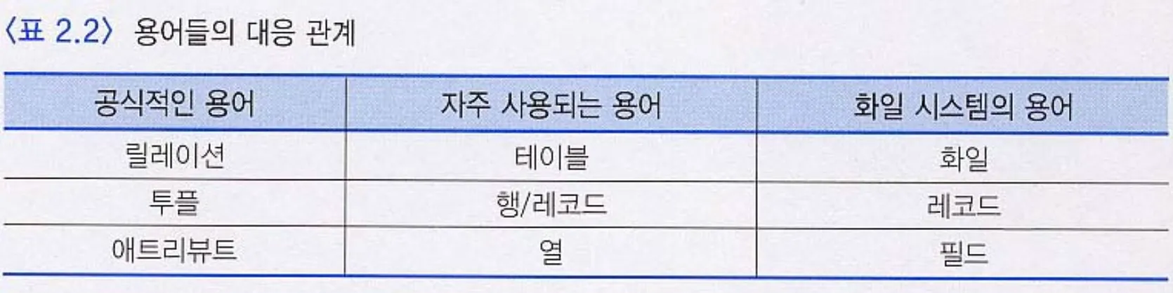 - 투플(tuple): 레코드를 좀 더 공식적으로 부르는 용어