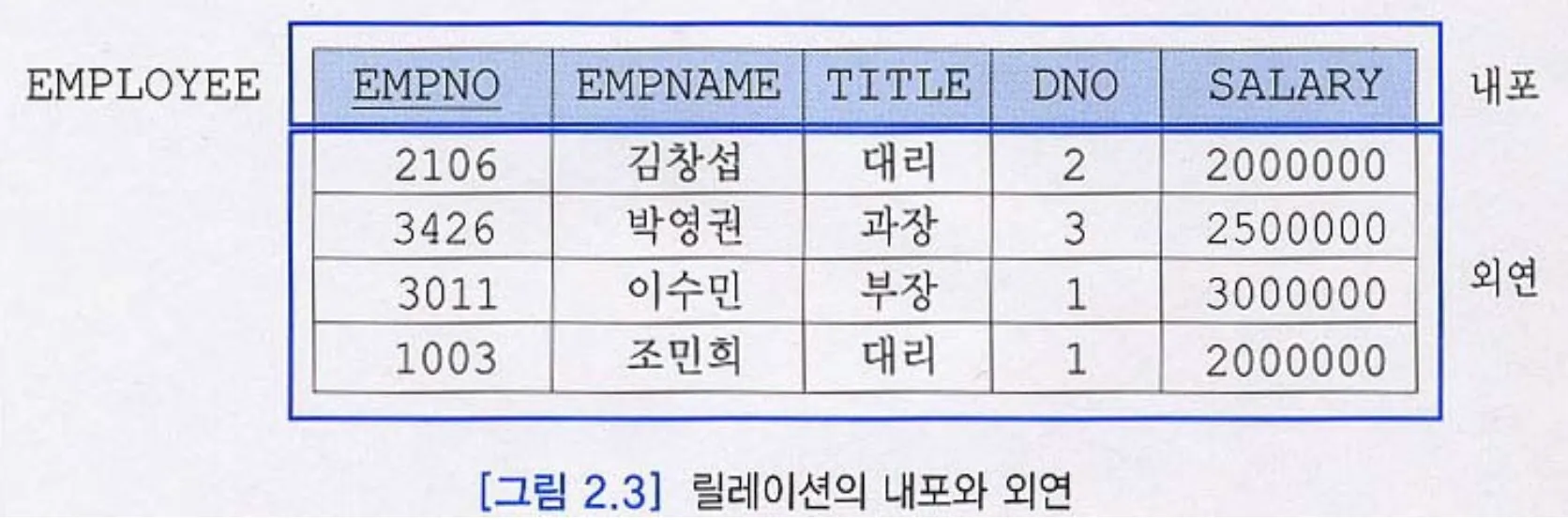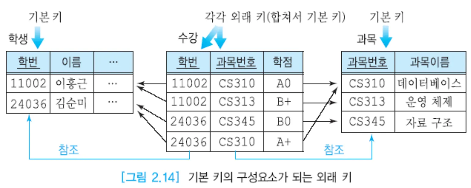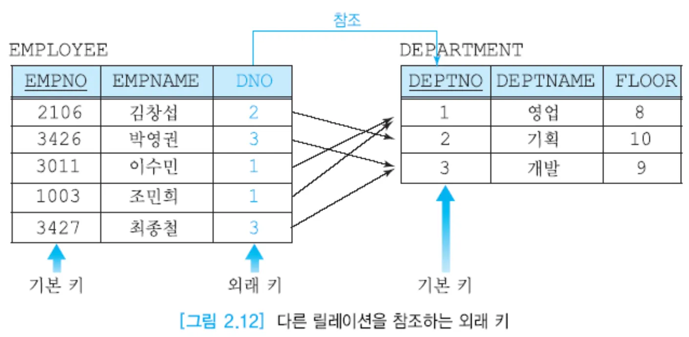 - 관계 데이터베이스가 릴레이션들로만 이루어지고, 릴레이션 사이의 관계들이 다른 릴레이션의 기본 키를 참조하는 것을 기반으로 하여 묵시적으로 표현되기 때문에 외래 키의 개념이 중요