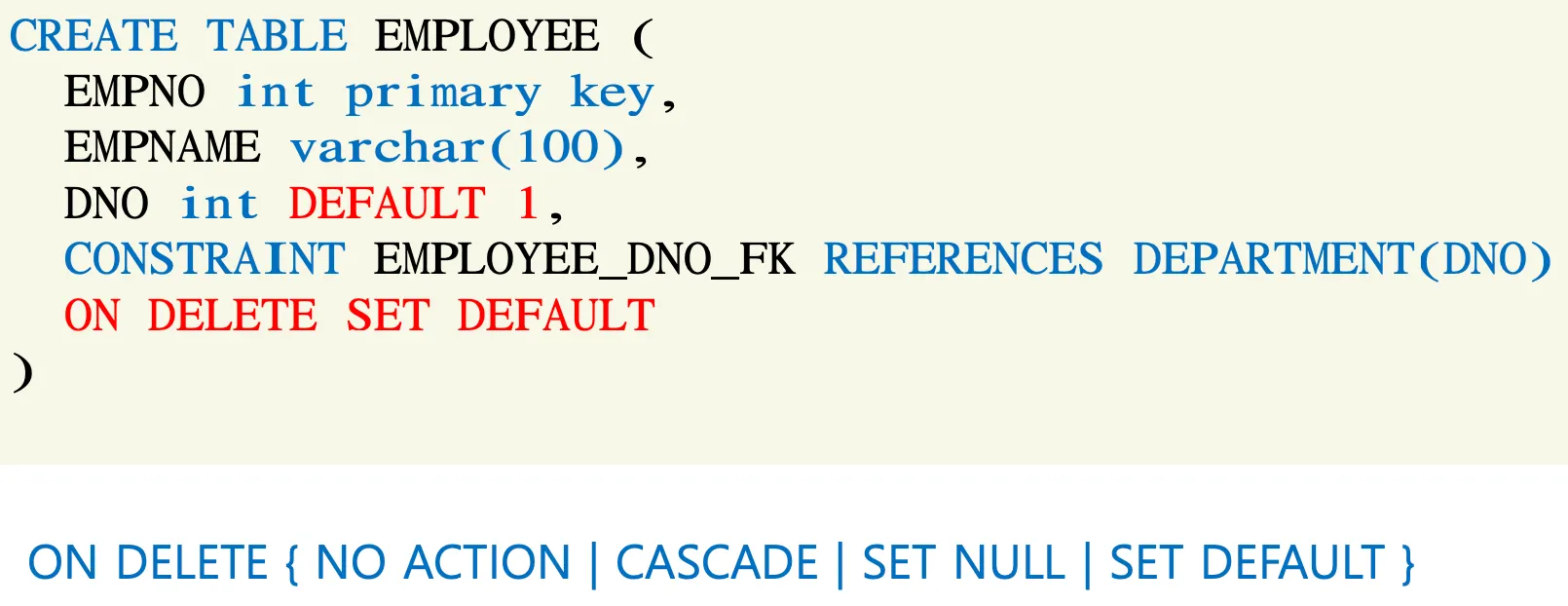 - 참조되는 릴레이션에서 투플을 삭제하고, 참조하는 릴레이션에서 이 투플을 참조하는 투플들의 외래 키에 널값을 삽입