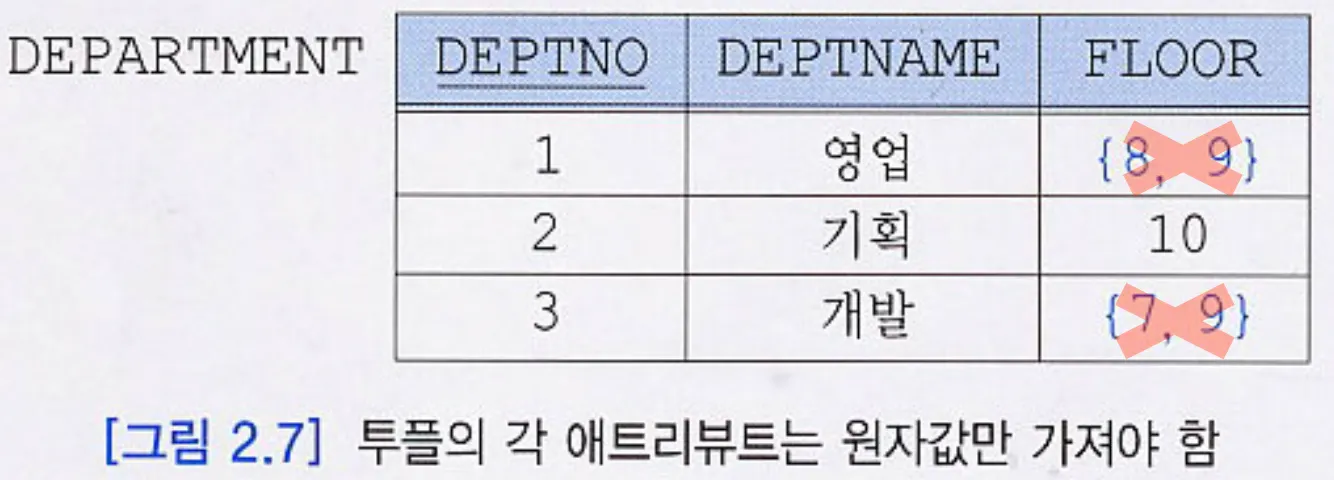 - 한 투플의 각 애트리뷰트는 원자값을 가짐