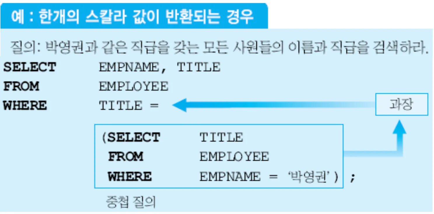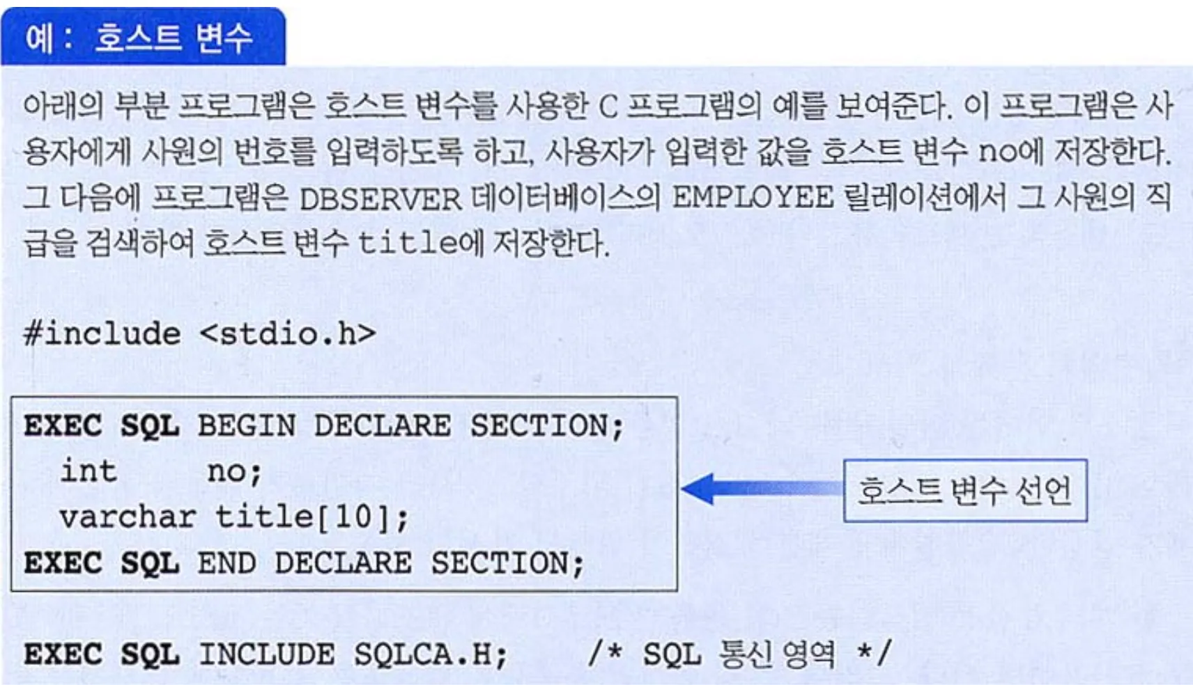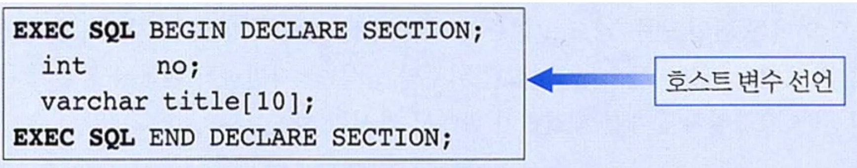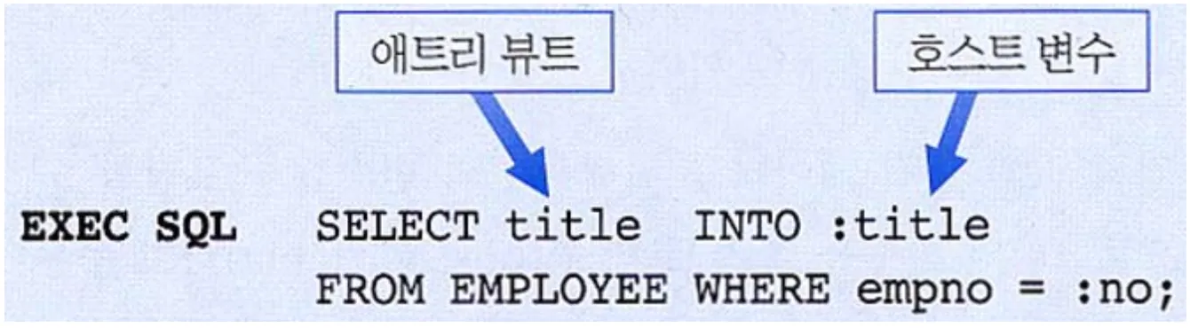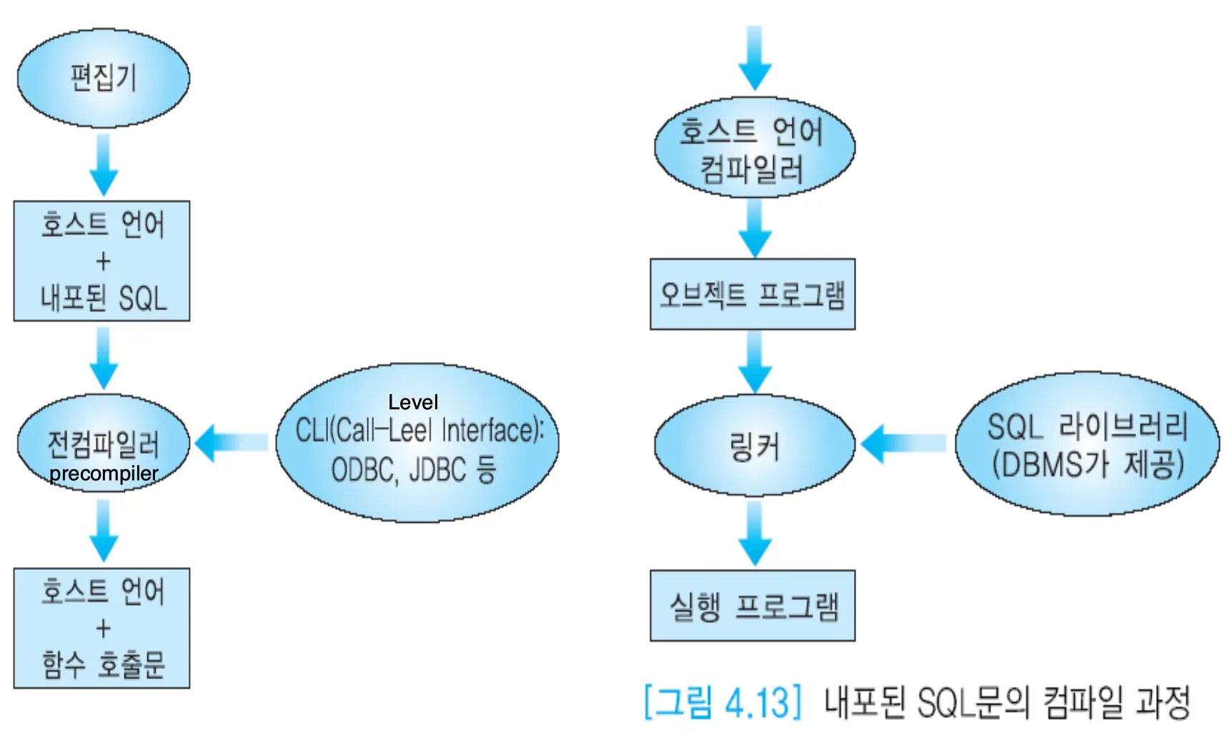- 호스트 언어에 포함되는 SQL문을 내포된 SQL이라 부름