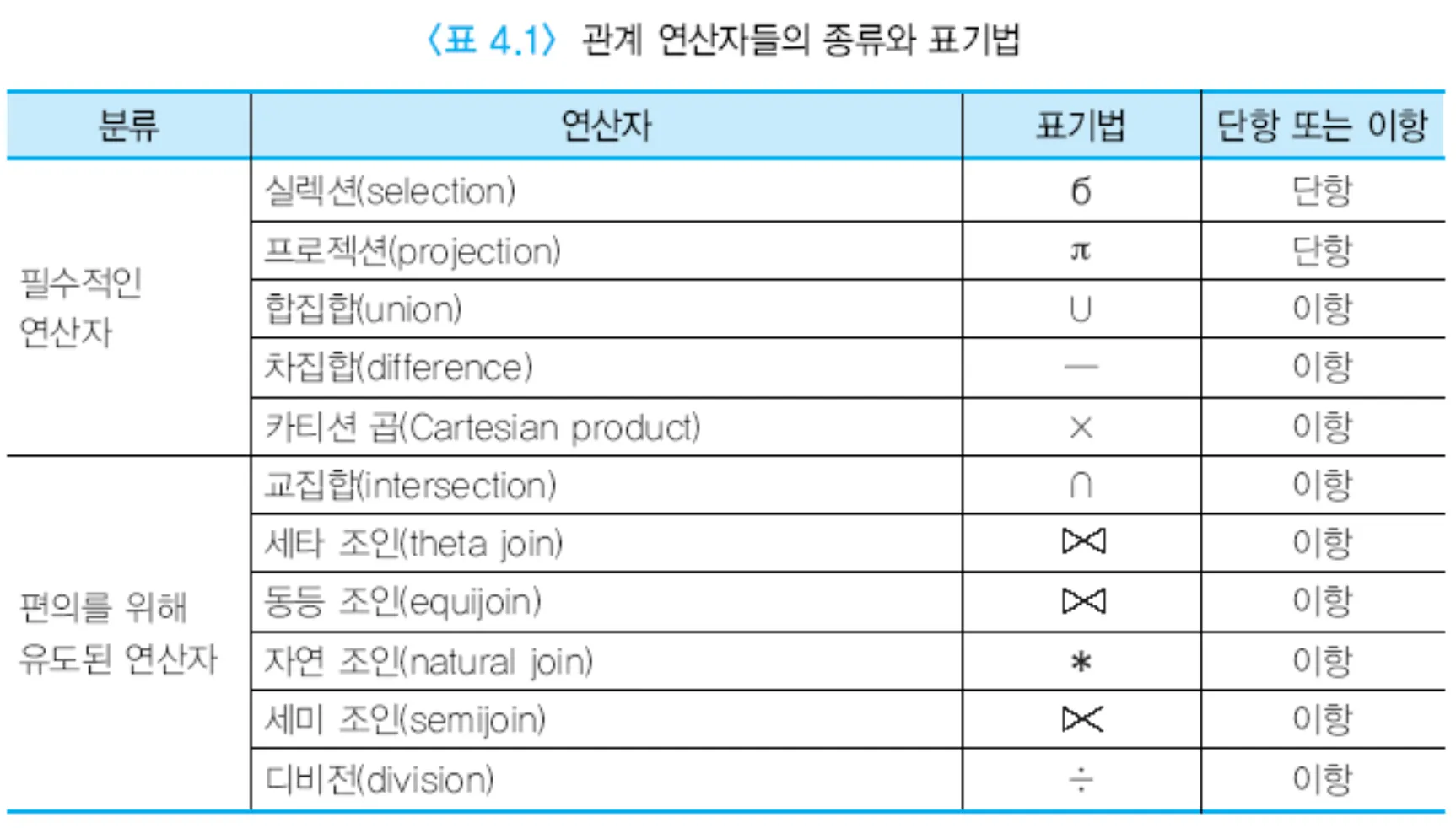 - 실렉션, 프로젝션, 합집합, 차집합, 카티션 곱은 관계 대수의 필수적인 연산자