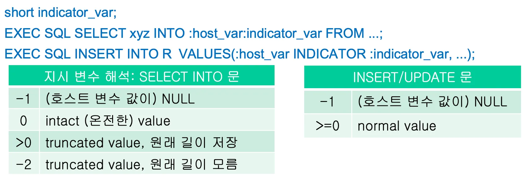 - 호스트 변수와 지시 변수 사이에 선택적으로 INDICATOR 키워드 사용 가능