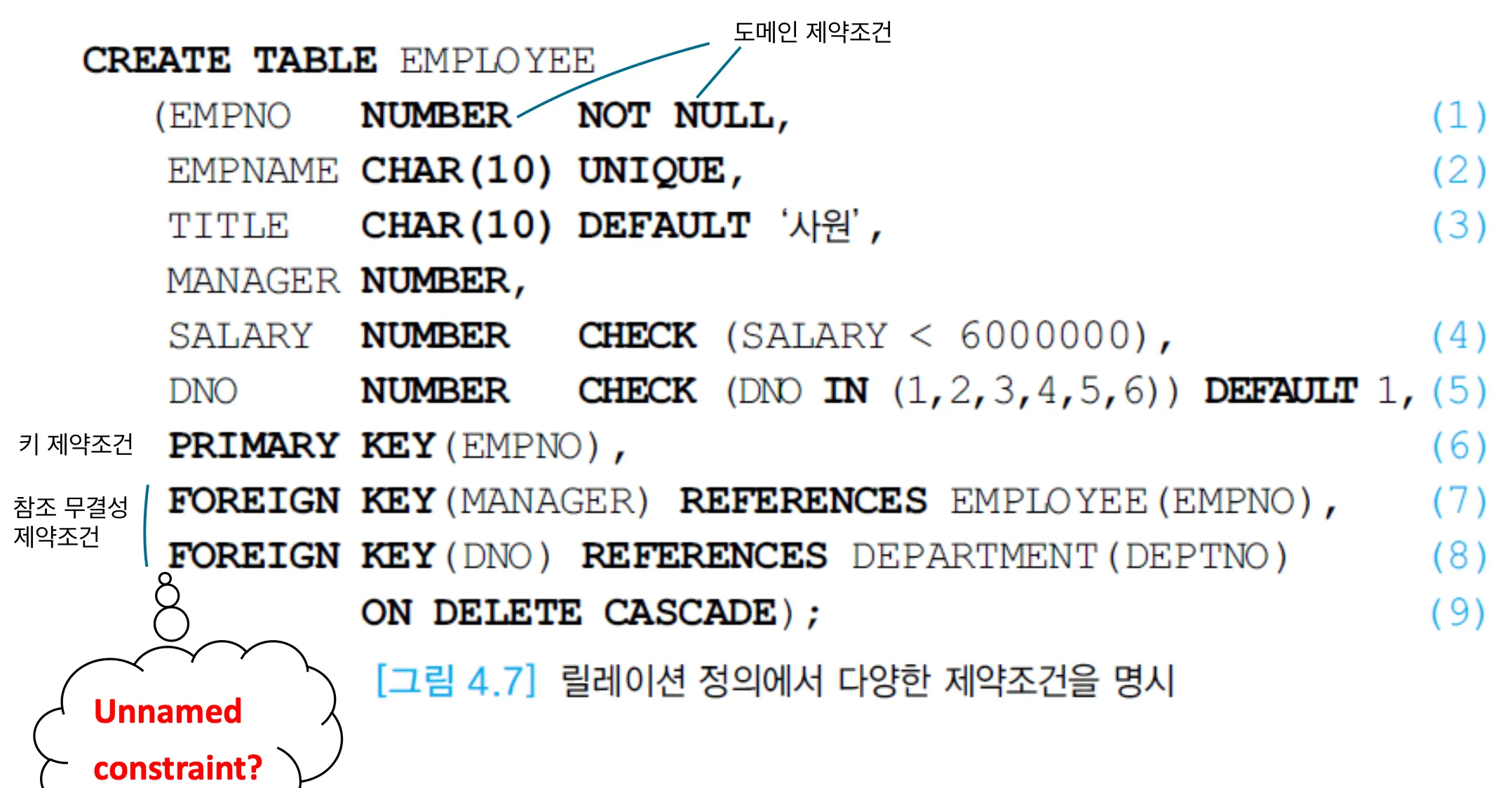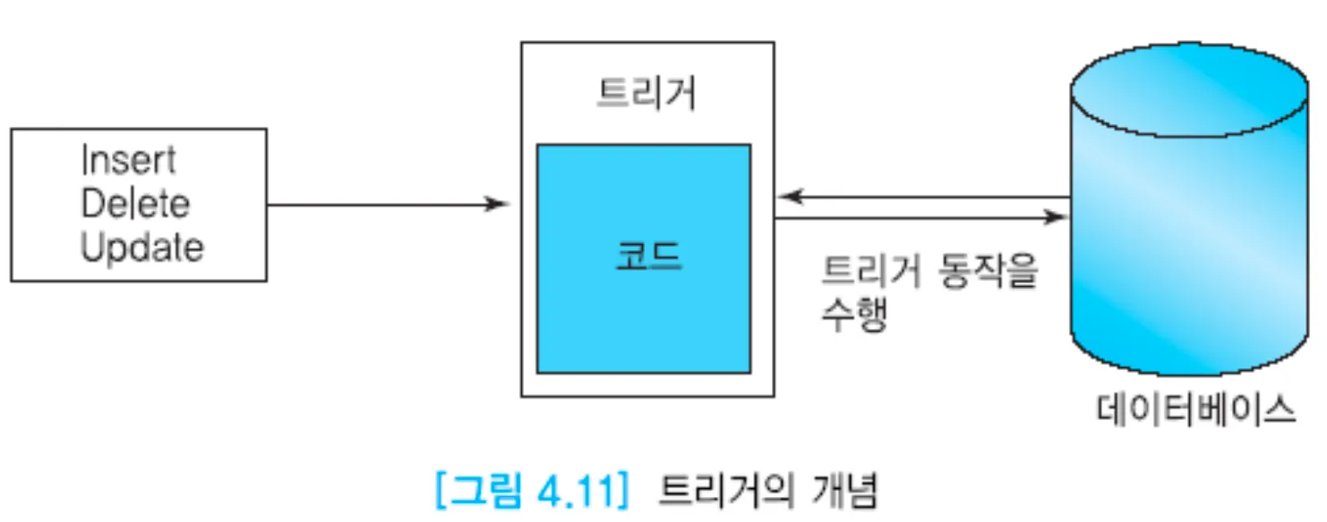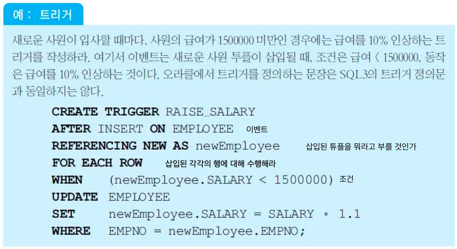 - 트리거: 제약조건을 위반했을 때 수행할 동작 명시