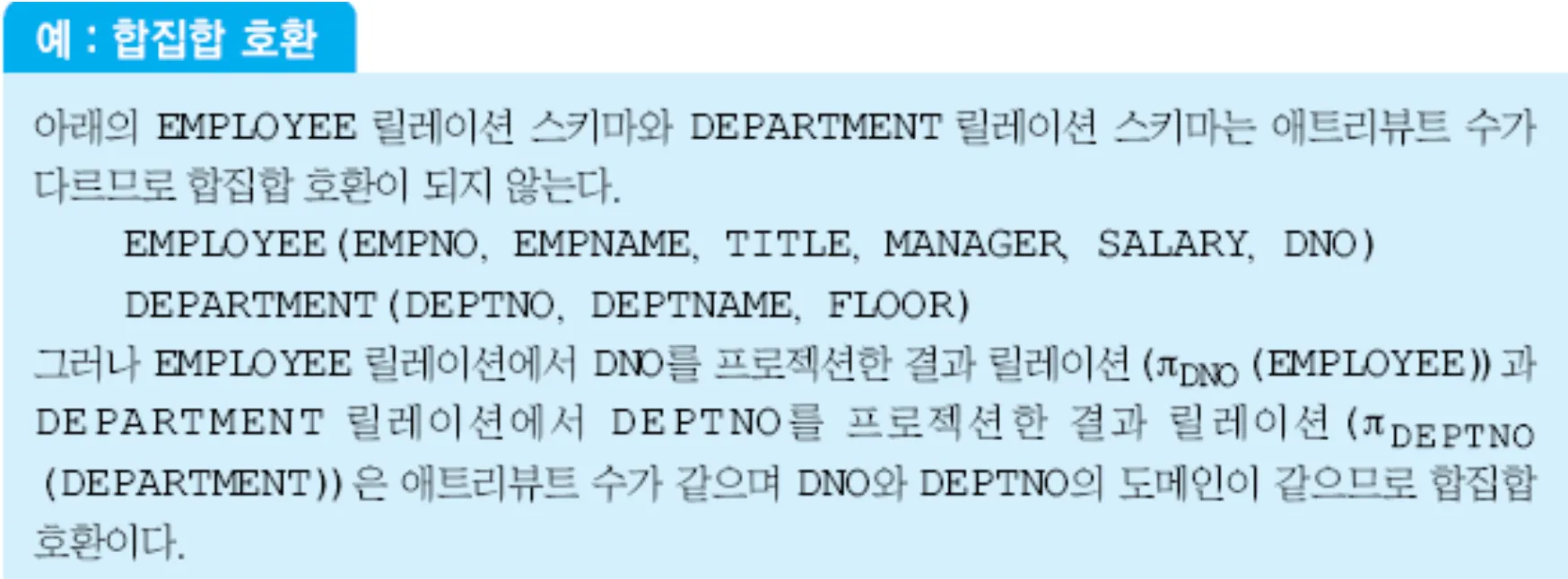 - 두 릴레이션 R1(A1, A2, …, An)과 R2(B1, B2, …, Bm)이 합집합 호환일 필요 충분 조건은 n=m이고, 모든 1 ≤ i ≤ n에 대해 domain(Ai) = domain(Bi)