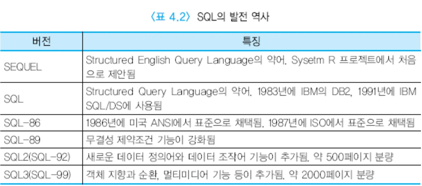 - 1986년에 ANSI(미국 표준 기구)에서 SQL 표준을 채택함으로써 SQL이 널리 사용되는데 기여