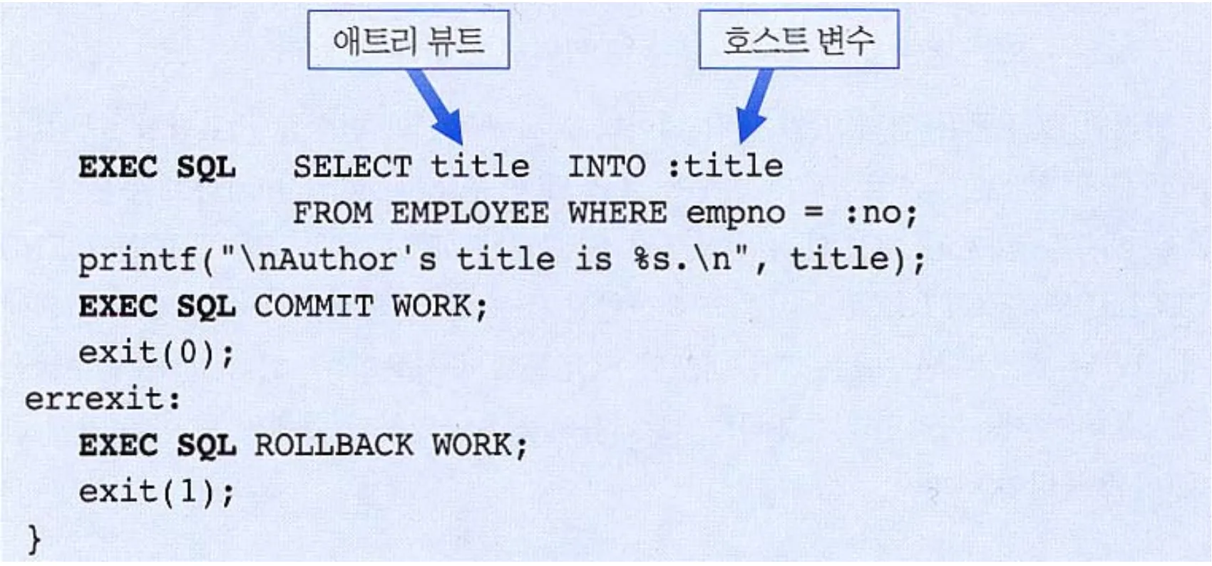 - C, C++, 코볼, 자바 등의 언어로 작성하는 프로그램에 SQL문을 삽입하여, 데이터베이스를 접근하는 부분을 SQL이 맡고 SQL에 없는 기능은 호스트 언어로 작성하는 것이 필요