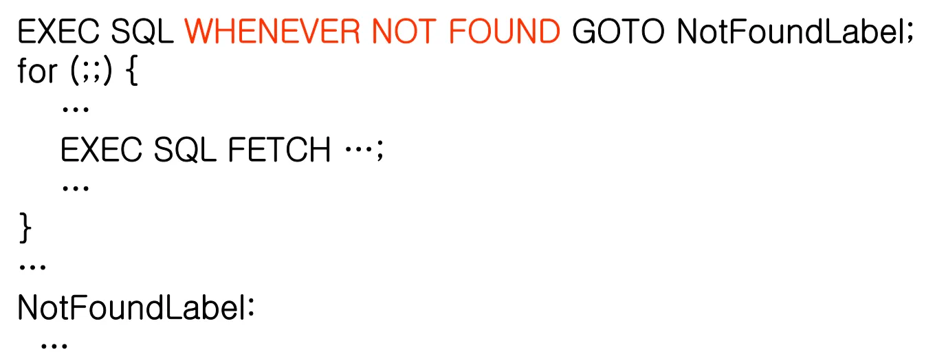 - 루프 종료 조건: 결과 집합이 비었거나 더 이상 가져올 투플이 없으면 FETCH문은 ‘no data found’에러를 발생시키고, WHENEVER NOT FOUND가 이를 인지함