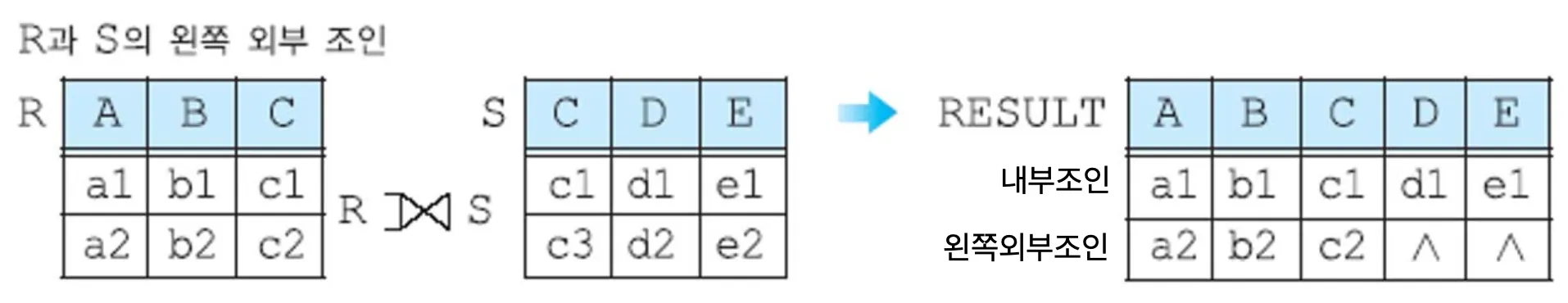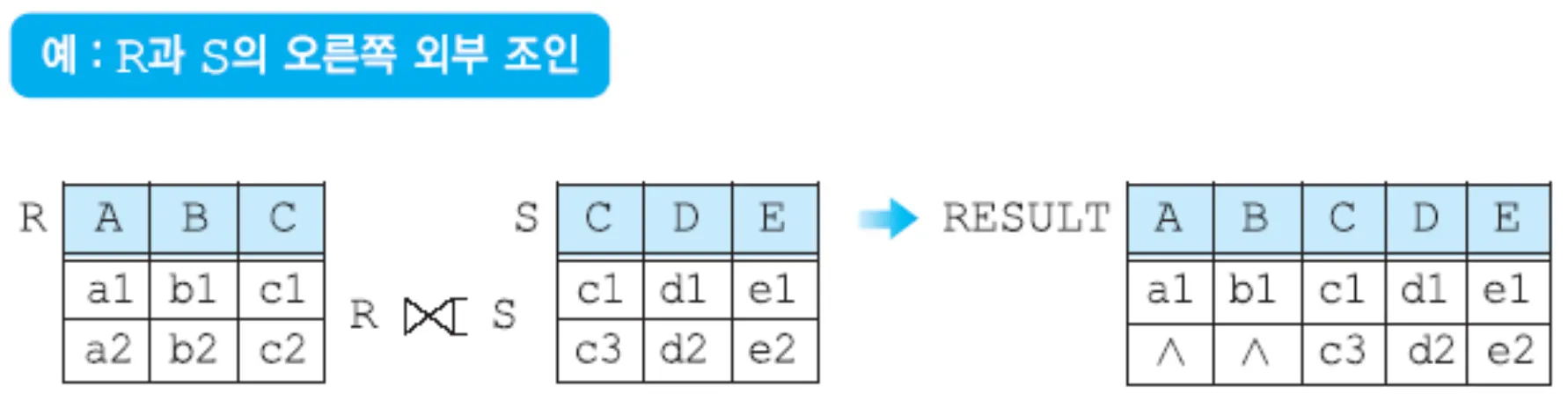- 두 릴레이션에서 대응되는 투플들을 결합하면서, 대응되는 투플을 갖지 않는 투플과 조인 애트리뷰트에 널값을 갖는 투플도 결과에 포함시킴