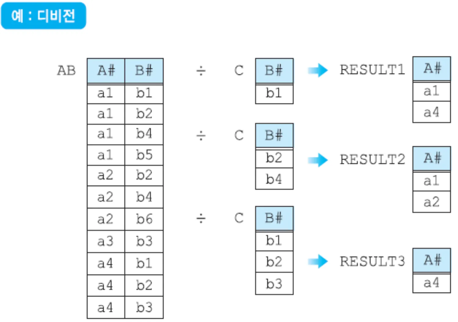 - 차수가 n+m인 릴레이션 R(A1, A2, …, An, B1, B2, …, Bm)과 차수가 m인 릴레이션 S(B1, B2, …, Bm)의 디비전 R ÷ S는 차수가 n이고, S에 속하는 모든 투플 u에 대하여 투플 tu(투플 t와 투플 u을 결합한 것)가 R에 존재하는 투플 t들의 집합