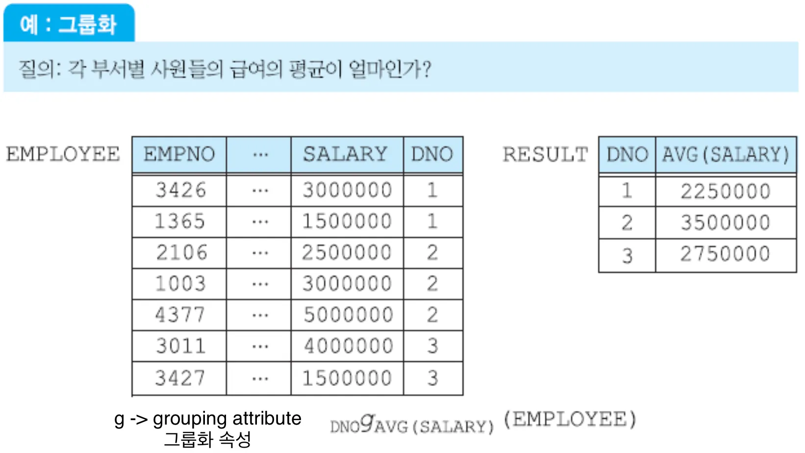 - 실제로 관계 데이터베이스에서 대부분의 질의는 실렉션, 프로젝션, 자연 조인으로 표현 가능