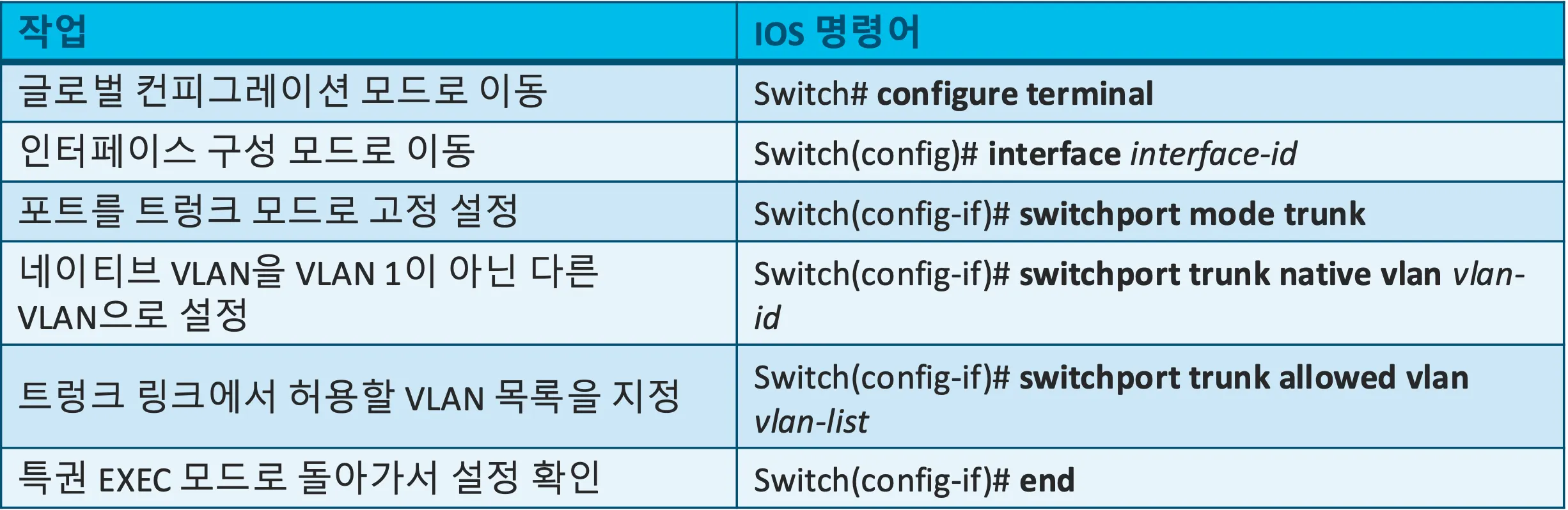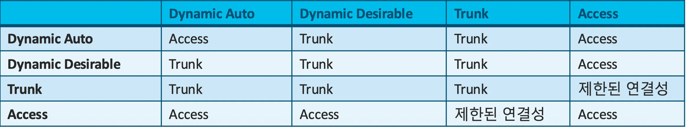 - switchport mode trunk 또는 switchport mode access 명령어를 이용하여 스위치를 트렁크 또는 액세스로 고정 설정하면 협상(negotiation)에 의한 이슈를 피할 수 있음