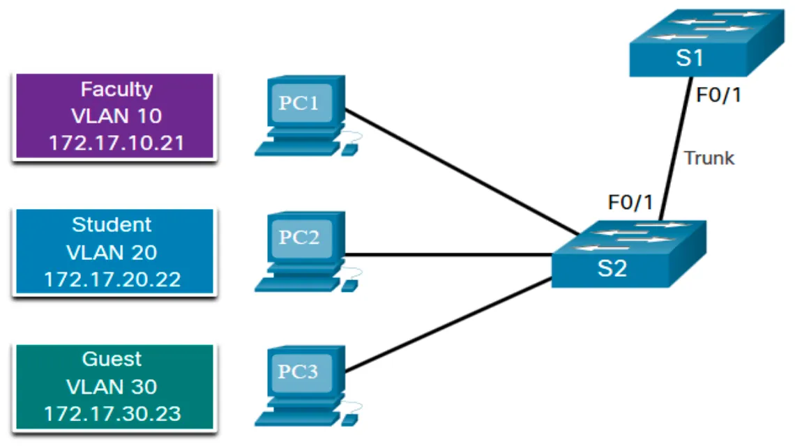 - S1 스위치 - S2 스위치: VLAN 트렁킹 구성 → VLAN 생성 및 이름 지정, 관리 인터페이스 생성, 액세스 포트 구성, 트렁킹 포트 구성