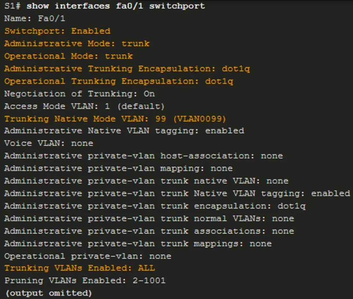 - Trunking Native Mode VLAN: 99 (VLAN0099) -네이티브 VLAN은 VLAN 99로 설정